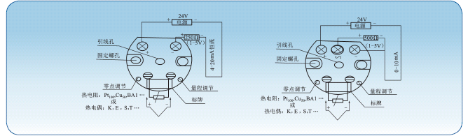 說(shuō)明:如果輸入距離較遠(yuǎn),影響精度的話,幾種型號(hào)的溫度變送器均可做成三線制輸入接法無(wú)需接補(bǔ)償導(dǎo)線,從而減小誤差,提高了精度,也可選擇智能型變送器達(dá)到測(cè)量目的。