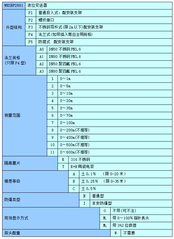 WHSBP2881液位變送器是引進(jìn)美國NOVA公司先進(jìn)的擴(kuò)散硅壓力傳感器和德國E+H公司陶瓷電容傳感器及ICSensors電路技術(shù)開發(fā)而成的,它應(yīng)用了硅精蝕工藝和硅晶片疊合兩項(xiàng)世界尖端技術(shù),是一種高品質(zhì)的靜壓式液位測量儀表,廣泛適用于石油、化工、冶金、環(huán)保、食品、水利、城市供水,油田等行業(yè)的液位測量。 WHSBP2881液位變送器的卓越品質(zhì),多種安裝方式方便了工藝現(xiàn)場的安裝,特殊場合可特殊設(shè)計(jì),滿足了我國工業(yè)自動化及部分行業(yè)的計(jì)量高精度液位檢測儀表的需求。